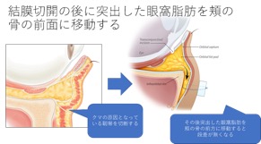 主として行うのは下まぶたの裏のしろめ(結膜)を切開し、突出した脂肪を切除するのではなく、頬の骨の前面に移動する手術です。